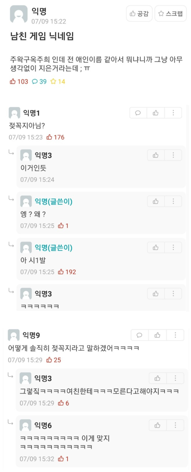 남친 게임 닉네임이 전여친 이름 같아요
