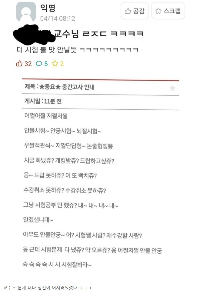 모 대학 교수의 시험 공지