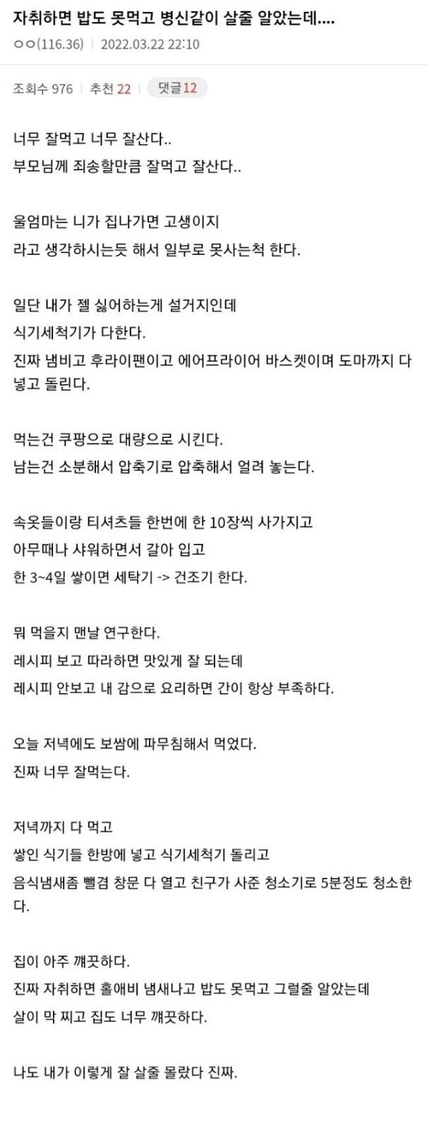 자취하면 ㅄ같이 살 줄 알았는데