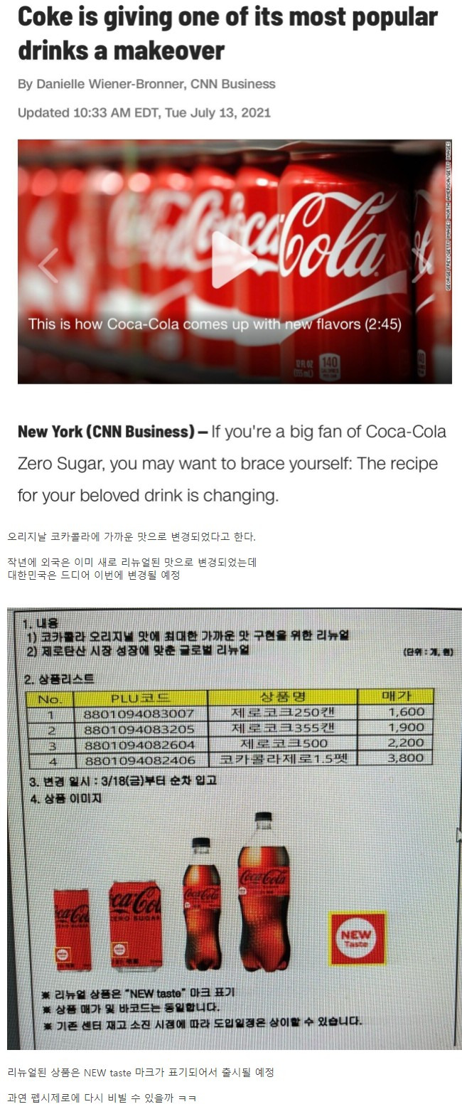 코카콜라 제로 드디어 맛 리뉴얼됨