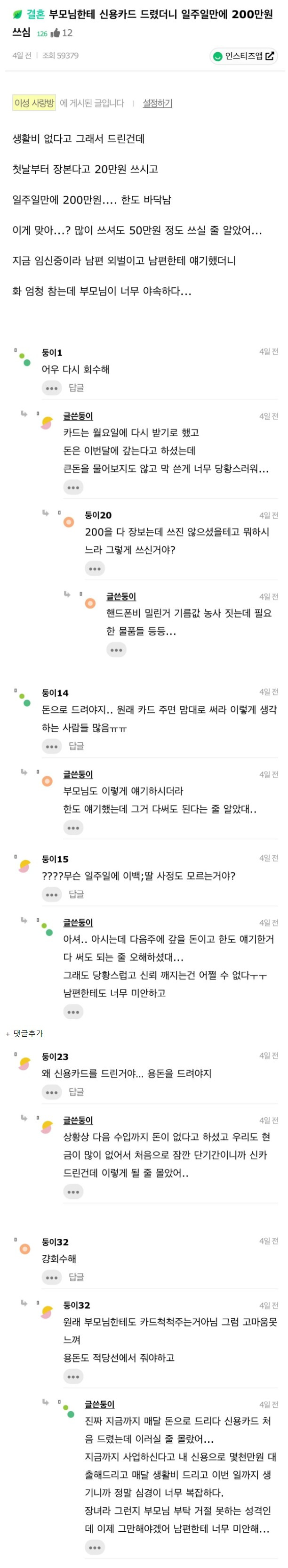 부모님한테 카드 드렸더니 1주일 200 씀