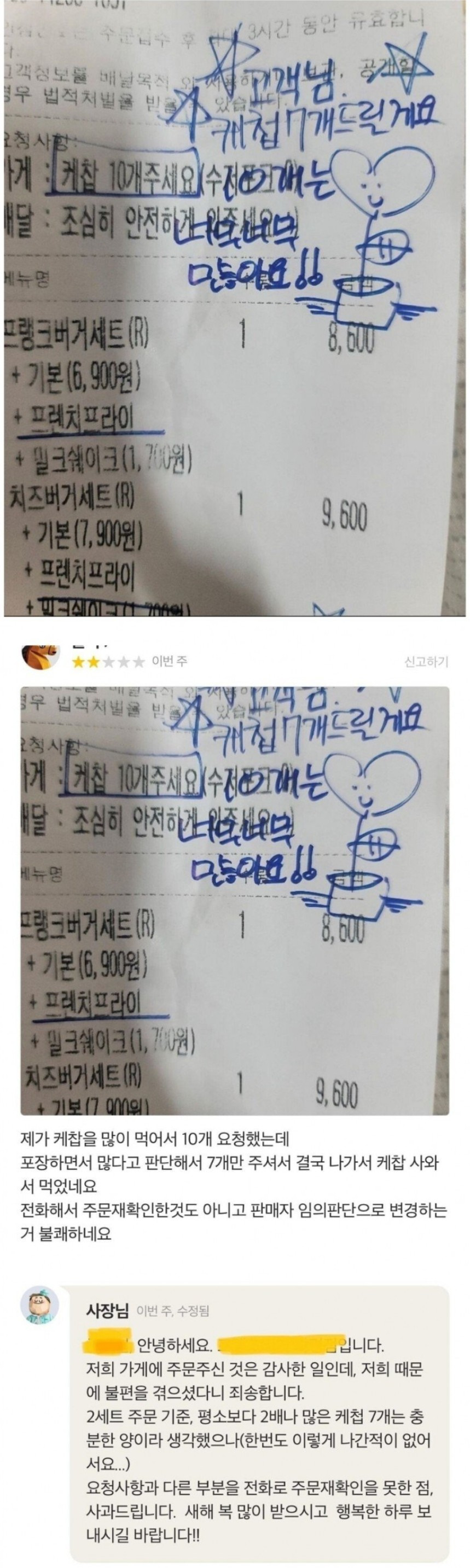 요청 안 들어줬다고 배민 별점 2개 준 사람