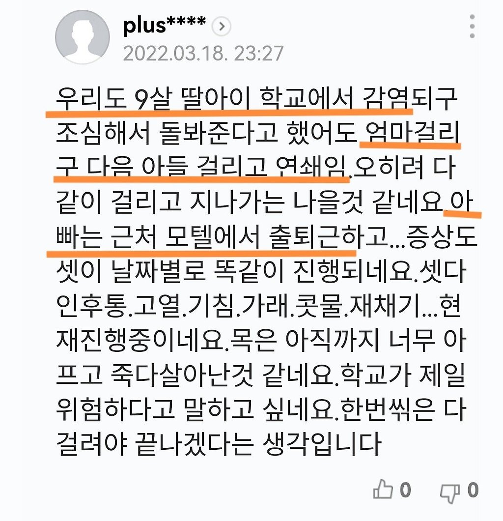 제일 이해안가는거는 매일매일 확진자가 몇명이니 하는 호들갑을 뉴스에서 떠들어대는거. 가족이 걸려도 등교나 등원 가능하다며? 인식을 감기처럼 바꾸자며? 그래놓고선 뭐 매일매일 확진이 몇명이 되었니 호들갑떨어대니 사람들 인식이 바뀔리가 있나? 학교도 학교지만 학원들도 만만찮을텐데 진심 국민 힘들게 만드는건 다름아니라 이 나라같음