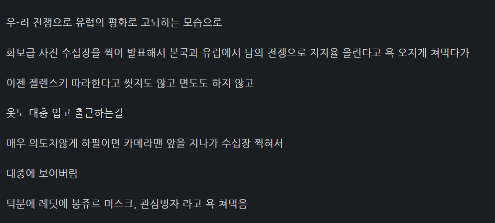 프랑스 마크롱 대통령 욕 먹는 이유 본문 48 피클포털 목록 EVENT) 지금 로그인 후 광고 제거 혜택을 받으세요! TIP) 초승달 아이콘을 누르고 어두운 화면으로 전환 해보세요 TIP) 본문 하단 무지개 로켓을 누르고 시간 여행을 떠나보세요 TIP) 빈 공간을 두 번 누르면 맨 아래로 바로 갈 수 있어요 TIP) 편지 아이콘이 무지개 빛으로 빛난다면 쪽지가 온거에요 TIP) 본문 하단 댓글 온/오프 버튼으로 숨기거나 펼칠 수 있습니다 오뚜기에 민원 넣은 썰 22.03.19 27227 아빠 제모크림을 머리에 바른 딸내미 22.03.19 102293 엔씨 신작게임 트레일러 댓글 수준.. 22.03.19 24320 수 천 만년된 공룡알을 깨버린 학자 22.03.19 117015 한국과는 다른 일본의 포켓몬 빵 상황 22.03.19 32072 몽쉘 한 봉지 때문에 49만원 날린 썰 22.03.18 30115 고속도로 통행료 체납 랭킹 1위 22.03.18 23916 병아리 3천만 마리 살처분한 이유... 22.03.18 22967 처음 이전 5873페이지 열린5874페이지 5875페이지 5876페이지 5877페이지 5878페이지 5879페이지 5880페이지 다음 맨끝 게시물 검색 검색대상 제목 내용 제목+내용 댓글작성자 검색어 필수 삭제요청