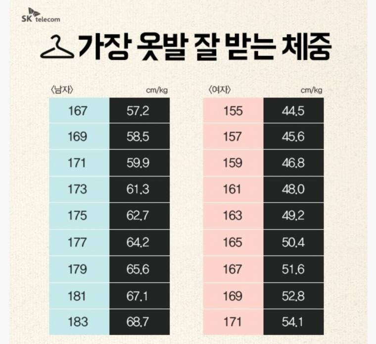 남녀 가장 옷빨 잘 받는 체중 정리표