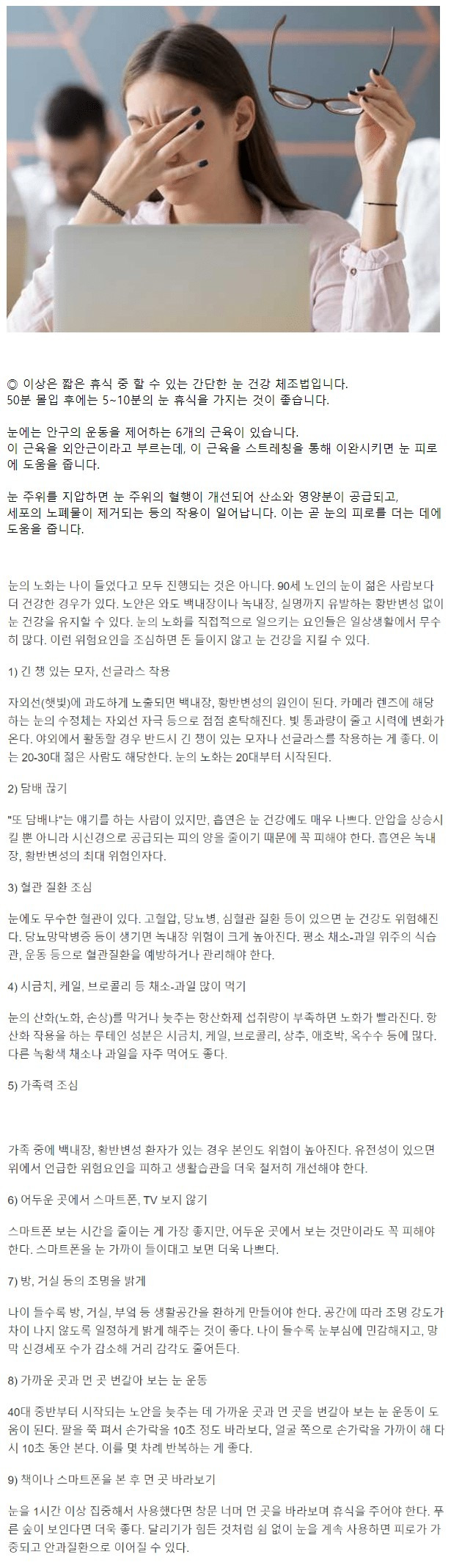 눈 노화를 예방하는 생활 습관 및 운동 21.06.09 본문 ① 눈동자를 상하좌우로 굴려 각각 5초씩 유지합니다.② 눈동자를 시계 방향으로 원을 그리듯 돌립니다. 반대 방향도 마찬가지로 돌려줍니다. (3회 반복)③ 눈 양쪽 옆 관자놀이(태양혈)를 꾹꾹 눌러줍니다.④ 눈썹 안쪽이 끝나는 곳(정명혈)을 엄지 손가락으로 눌러줍니다.⑤ 양 손바닥을 비벼서 따듯하게 한 후 눈 위를 덮어줍니다. 넉살님의 댓글 넉살 21.06.10 | 신고 눈돌리기 하는 도중에 강도를 만나면 어쩌죠? 만약 전국민이 눈돌리기를 매일 모두 실행하는데 그중에 한두명은 눈돌리기때문에 강도에게 대처를 못한다면..?? 드립입니다..ㅈㅣ 송 ㅋㅋ 눈돌리기 하는 도중에 강도를 만나면 어쩌죠? 만약 전국민이 눈돌리기를 매일 모두 실행하는데 그중에 한두명은 눈돌리기때문에 강도에게 대처를 못한다면..?? 드립입니다..ㅈㅣ 송 ㅋㅋ 탬니님의 댓글 탬니 22.11.25 | 신고 {짤방콘:MEME - A.jpg}
