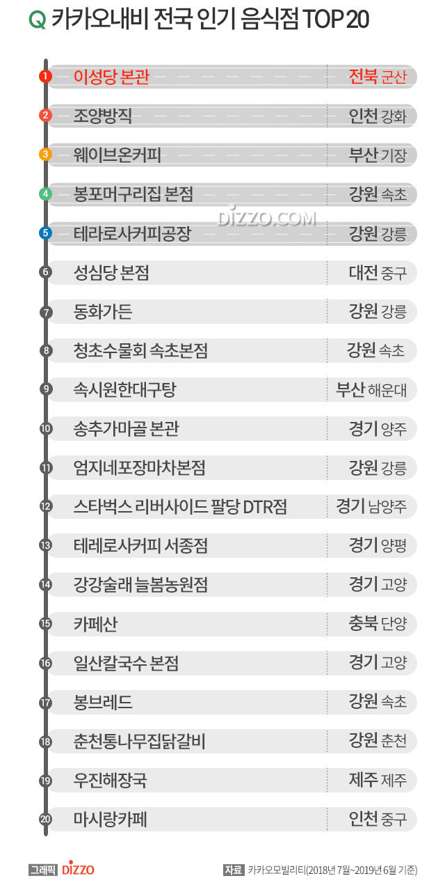 카카오내비 전국 인기 음식점 TOP 20