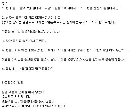 별명님의 댓글 별명 19.09.06 | 신고 +)미신이지만 집안에 아픈 사람이 있는 경우 망자의 혼이 병자에게 깃들 수 있다고 여겨 장례식에 참여하지 않기도 한다네요 +)미신이지만 집안에 아픈 사람이 있는 경우 망자의 혼이 병자에게 깃들 수 있다고 여겨 장례식에 참여하지 않기도 한다네요
