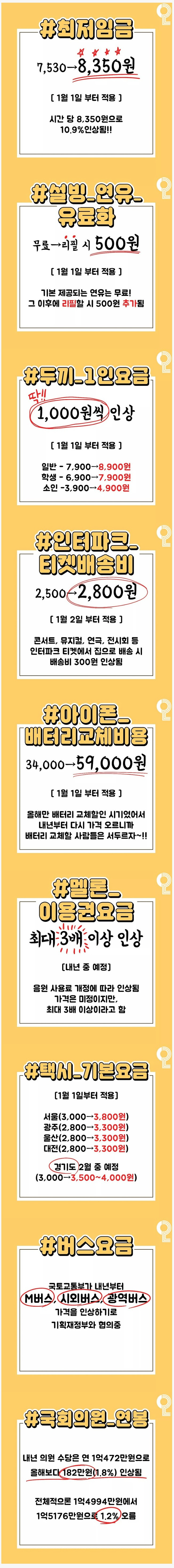 내년부터 인상되는 비용 리스트