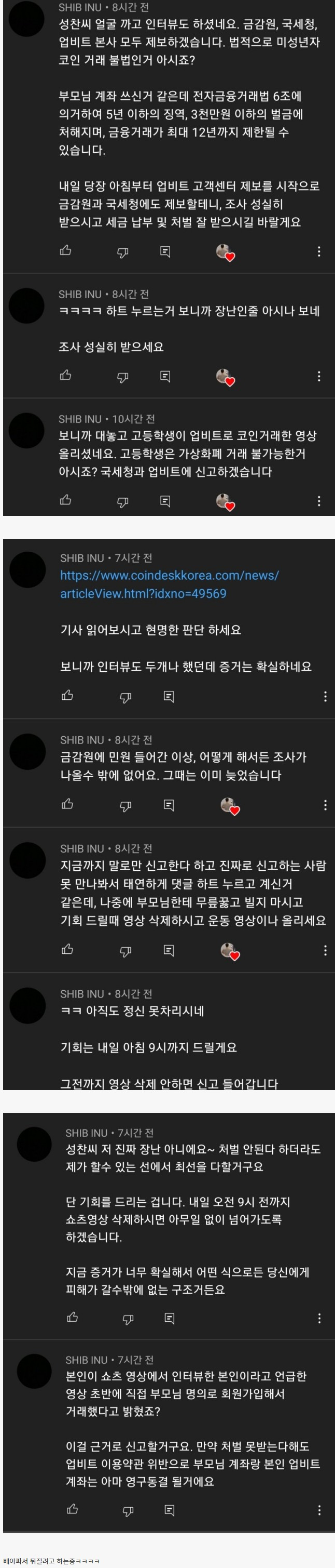 코인으로 대박난 고딩 유튜버에게 달린 댓글