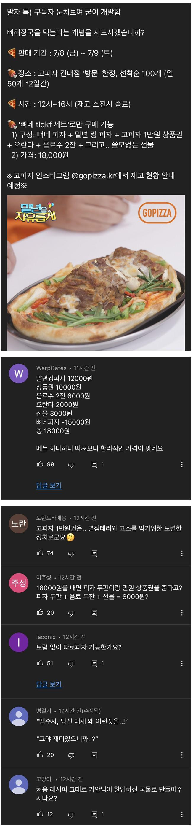 기안84가 개발한 뼈네피자 근황 본문 0 피클인방 목록 EVENT) 지금 로그인 후 광고 제거 혜택을 받으세요! TIP) 초승달 아이콘을 누르고 어두운 화면으로 전환 해보세요 TIP) 본문 하단 무지개 로켓을 누르고 시간 여행을 떠나보세요 TIP) 빈 공간을 두 번 누르면 맨 아래로 바로 갈 수 있어요 TIP) 편지 아이콘이 무지개 빛으로 빛난다면 쪽지가 온거에요 TIP) 본문 하단 댓글 온/오프 버튼으로 숨기거나 펼칠 수 있습니다 스케일링은 치위생사가 하는 이유 23.08.27 404813 지기TV 복귀에 또 피해 받는 채널.. 23.08.26 38358 악플러 선처 해줬더니 생긴 일 23.08.26 418705 10년 차 아이폰 유저로서 불편한 점 23.08.26 314823 170kg 뚱보남 렌탈하기 23.08.26 311912 음악 유튜브 뜻밖의 썸네일 어그로 23.08.26 329295 예산 맥주 축제 미리가본 유튜버 리뷰 23.08.25 20094 침착맨 옥냥이 술 먹방 전 후 비교 23.08.25 310436 열린1페이지 2페이지 3페이지 4페이지 5페이지 6페이지 7페이지 8페이지 다음 맨끝 게시물 검색 검색대상 제목 내용 제목+내용 댓글작성자 검색어 필수 삭제요청