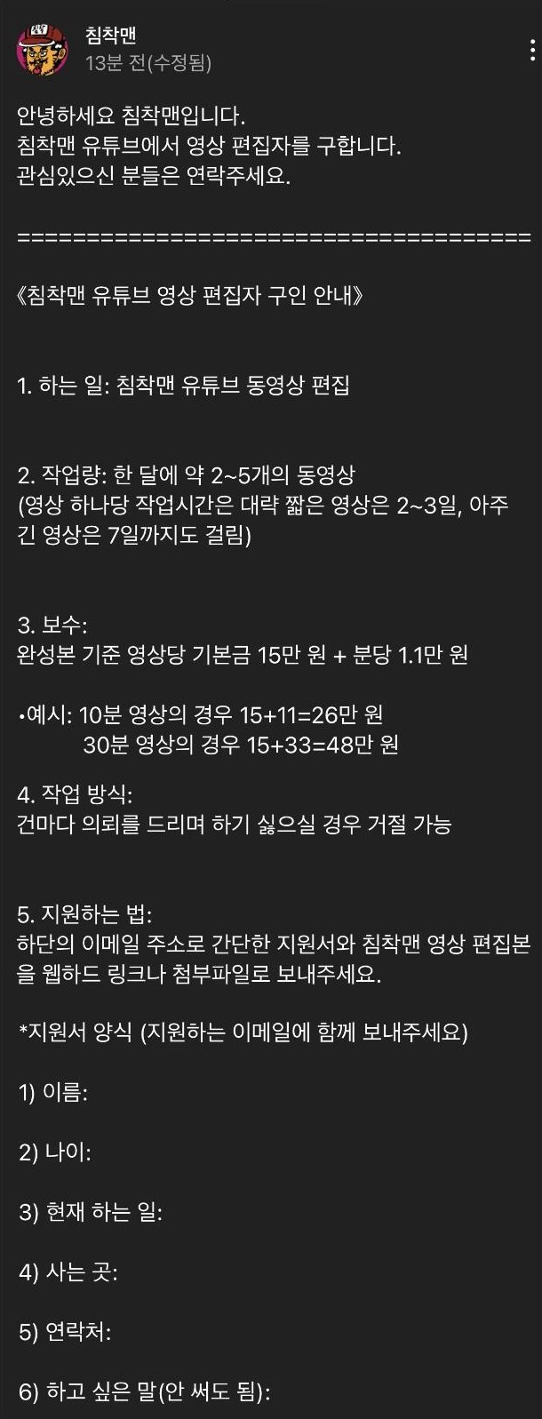 편집자 공고 단가 시원하게 까버린 침착맨