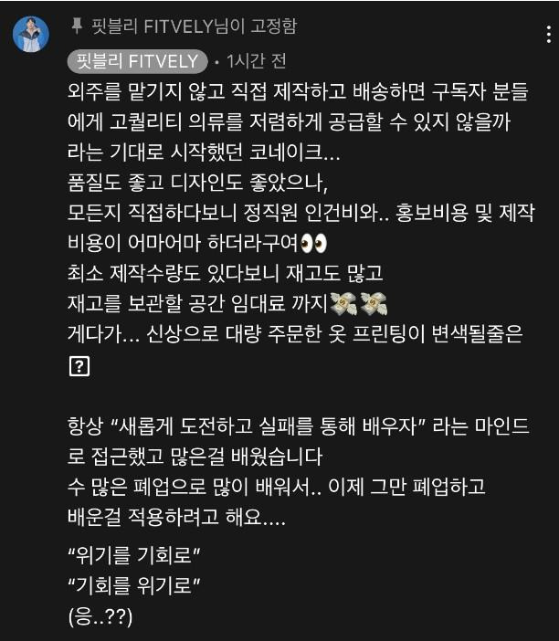 사업 다 말아 먹은 타락헬창 근황 본문 0 피클인방 목록 EVENT) 지금 로그인 후 광고 제거 혜택을 받으세요! TIP) 초승달 아이콘을 누르고 어두운 화면으로 전환 해보세요 TIP) 본문 하단 무지개 로켓을 누르고 시간 여행을 떠나보세요 TIP) 빈 공간을 두 번 누르면 맨 아래로 바로 갈 수 있어요 TIP) 편지 아이콘이 무지개 빛으로 빛난다면 쪽지가 온거에요 TIP) 본문 하단 댓글 온/오프 버튼으로 숨기거나 펼칠 수 있습니다 스케일링은 치위생사가 하는 이유 23.08.27 404804 지기TV 복귀에 또 피해 받는 채널.. 23.08.26 38356 악플러 선처 해줬더니 생긴 일 23.08.26 418704 10년 차 아이폰 유저로서 불편한 점 23.08.26 314817 170kg 뚱보남 렌탈하기 23.08.26 311905 음악 유튜브 뜻밖의 썸네일 어그로 23.08.26 329290 예산 맥주 축제 미리가본 유튜버 리뷰 23.08.25 20089 침착맨 옥냥이 술 먹방 전 후 비교 23.08.25 310428 열린1페이지 2페이지 3페이지 4페이지 5페이지 6페이지 7페이지 8페이지 다음 맨끝 게시물 검색 검색대상 제목 내용 제목+내용 댓글작성자 검색어 필수 삭제요청