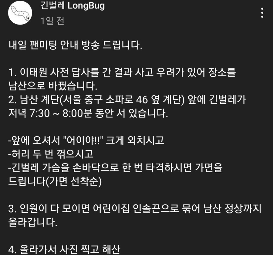 이태원 사전답사 후 팬미팅 장소 바꾼 유튜버