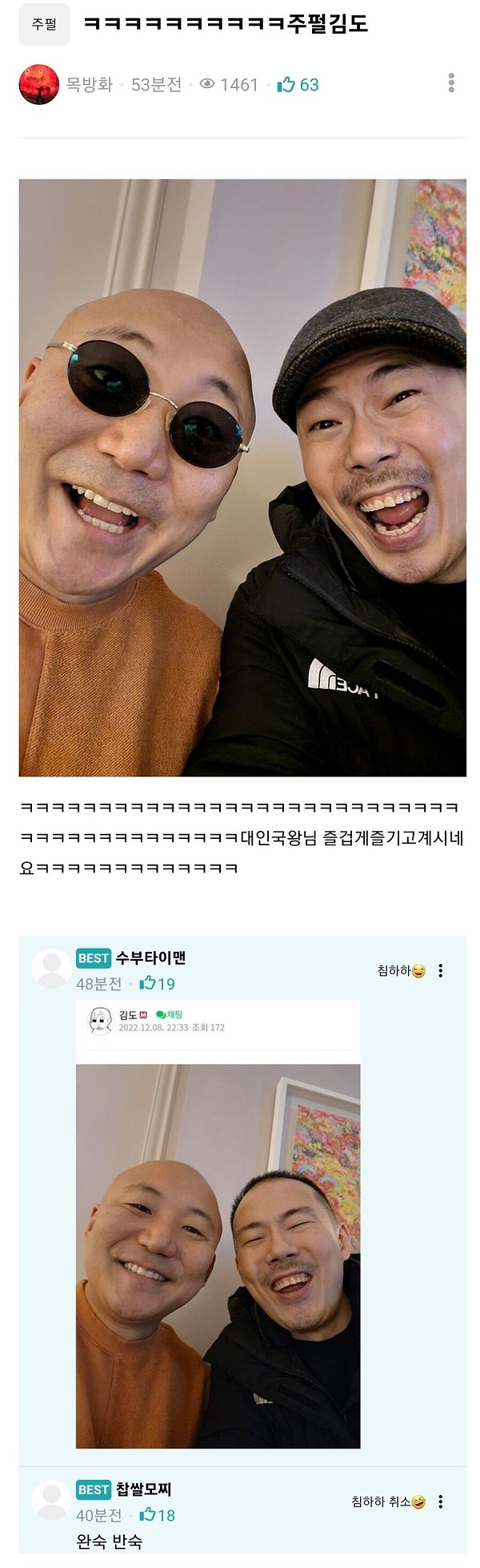 김도를 만난 주펄 본문 0 피클인방 목록 EVENT) 지금 로그인 후 광고 제거 혜택을 받으세요! TIP) 초승달 아이콘을 누르고 어두운 화면으로 전환 해보세요 TIP) 본문 하단 무지개 로켓을 누르고 시간 여행을 떠나보세요 TIP) 빈 공간을 두 번 누르면 맨 아래로 바로 갈 수 있어요 TIP) 편지 아이콘이 무지개 빛으로 빛난다면 쪽지가 온거에요 TIP) 본문 하단 댓글 온/오프 버튼으로 숨기거나 펼칠 수 있습니다 스케일링은 치위생사가 하는 이유 23.08.27 404813 지기TV 복귀에 또 피해 받는 채널.. 23.08.26 38366 악플러 선처 해줬더니 생긴 일 23.08.26 418705 10년 차 아이폰 유저로서 불편한 점 23.08.26 314830 170kg 뚱보남 렌탈하기 23.08.26 311914 음악 유튜브 뜻밖의 썸네일 어그로 23.08.26 329303 예산 맥주 축제 미리가본 유튜버 리뷰 23.08.25 20094 침착맨 옥냥이 술 먹방 전 후 비교 23.08.25 310436 열린1페이지 2페이지 3페이지 4페이지 5페이지 6페이지 7페이지 8페이지 다음 맨끝 게시물 검색 검색대상 제목 내용 제목+내용 댓글작성자 검색어 필수 삭제요청